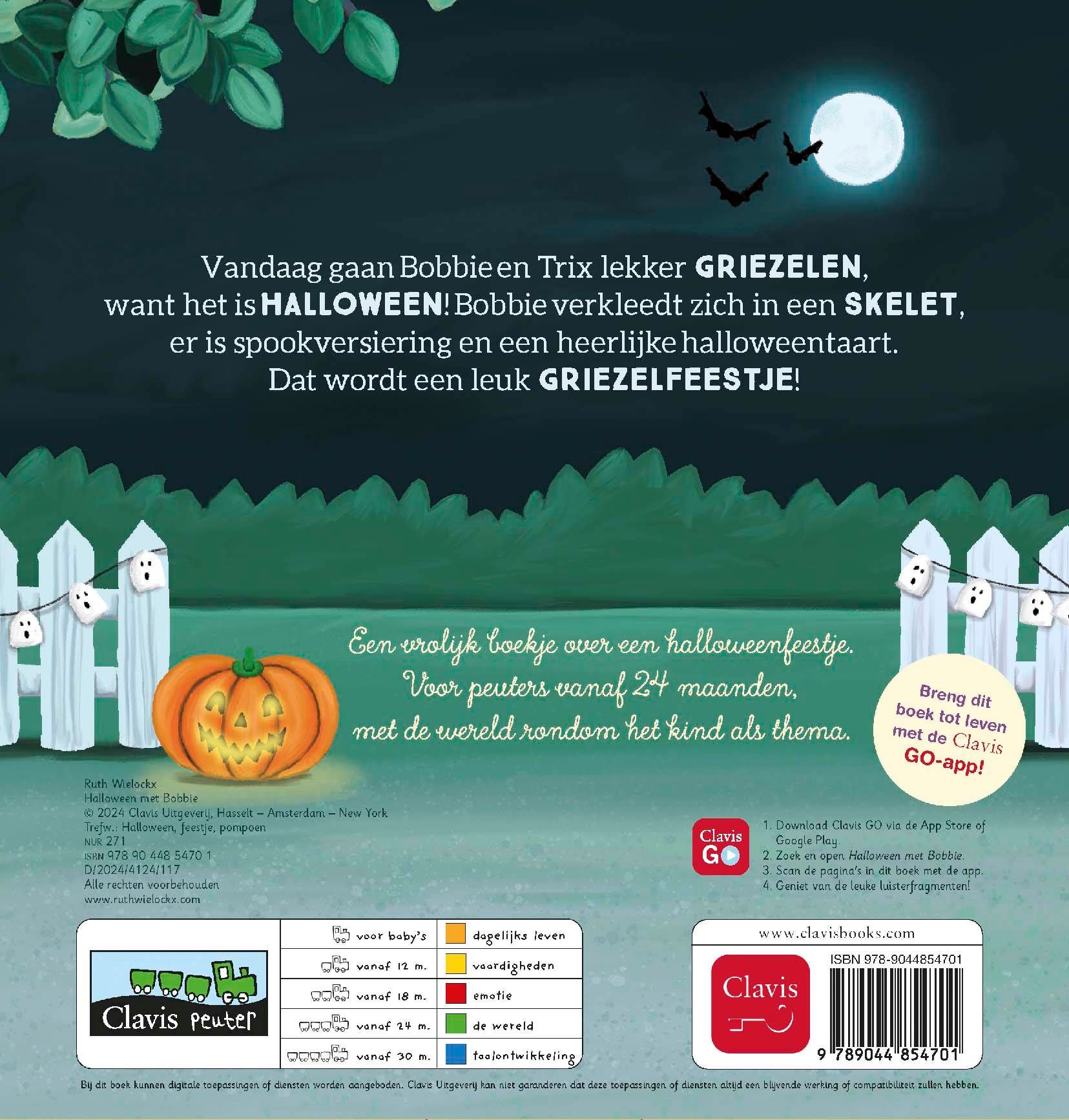 Vandaag gaan Bobbie en Trix lekker griezelen, want het is Halloween! Bobbie verkleedt zich in een skelet, er is spookversiering en een heerlijke halloweentaart. Dat wordt een leuk griezelfeestje! Een vrolijk boekje over een halloweenfeestje. Voor peuters vanaf 24 maanden, met de wereld rondom het kind als thema.