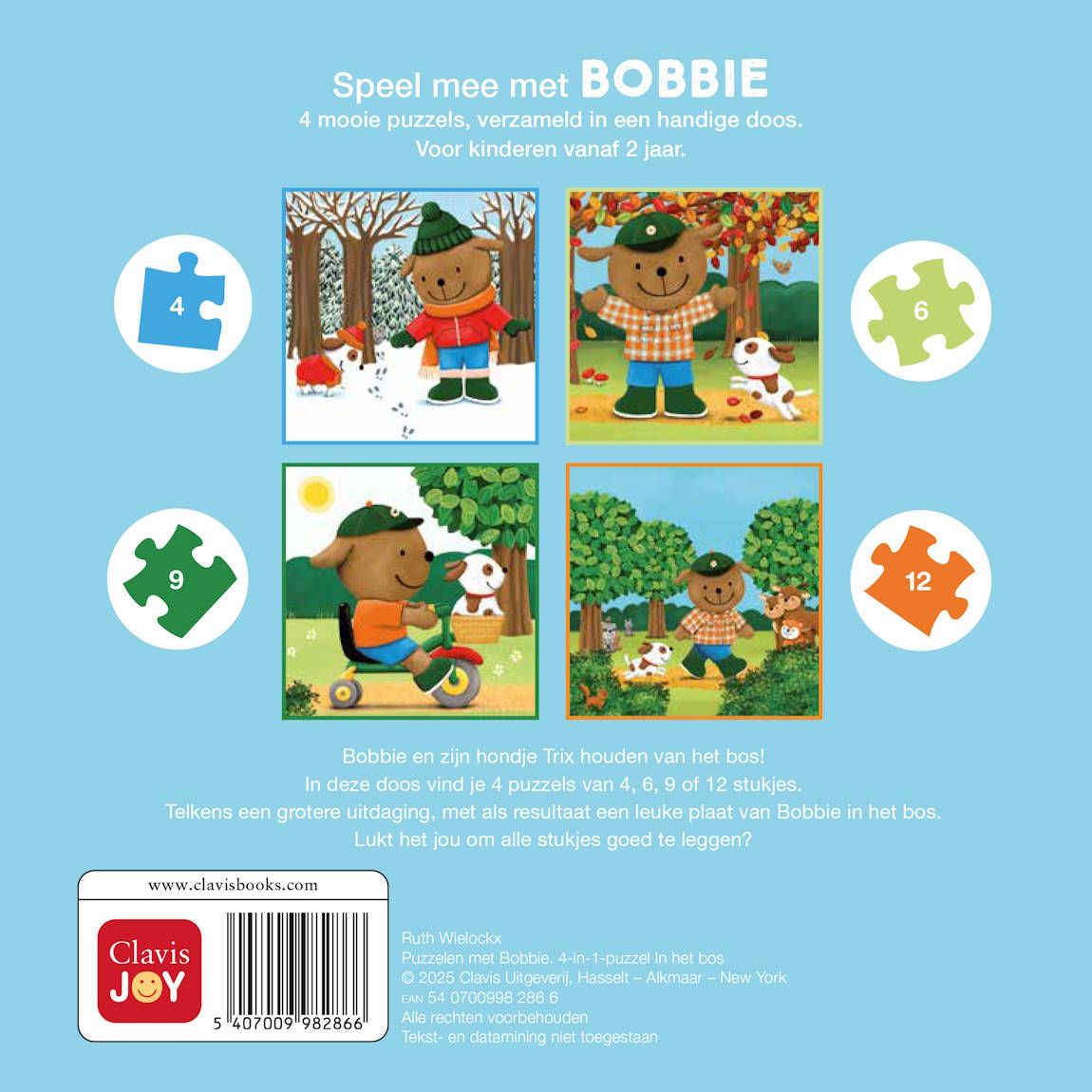 Speel mee met Bobbie! 4 mooie puzzels, verzameld in een handige doos. Voor kinderen vanaf 2 jaar. Bobbie en zijn hondje Trix houden van het bos! In deze doos vind je 4 puzzels van 4, 6, 9 of 12 stukjes. Telkens een grotere uitdaging, met als resultaat een leuke plaat van Bobbie in het bos. Lukt het jou om alle stukjes goed te leggen?