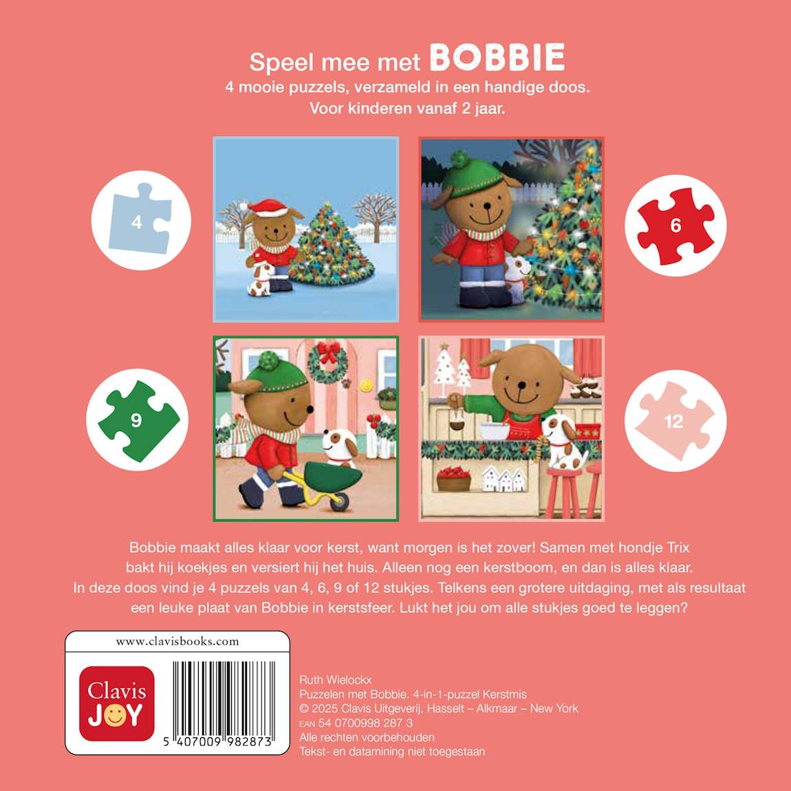 Speel mee met Bobbie. 4 mooie puzzels, verzameld in een handige doos. Voor kinderen vanaf 2 jaar. Bobbie maakt alles klaar voor kerst, want morgen is het zover! Samen met hondje Trix bakt hij koekjes en versiert hij het huis. Alleen nog een kerstboom, en dan is alles klaar. In deze doos vind je 4 puzzels van 4, 6, 9 of 12 stukjes. Telkens een grotere uitdaging, met als resultaat een leuke plaat van Bobbie in kerstsfeer. Lukt het jou om alle stukjes goed te leggen?