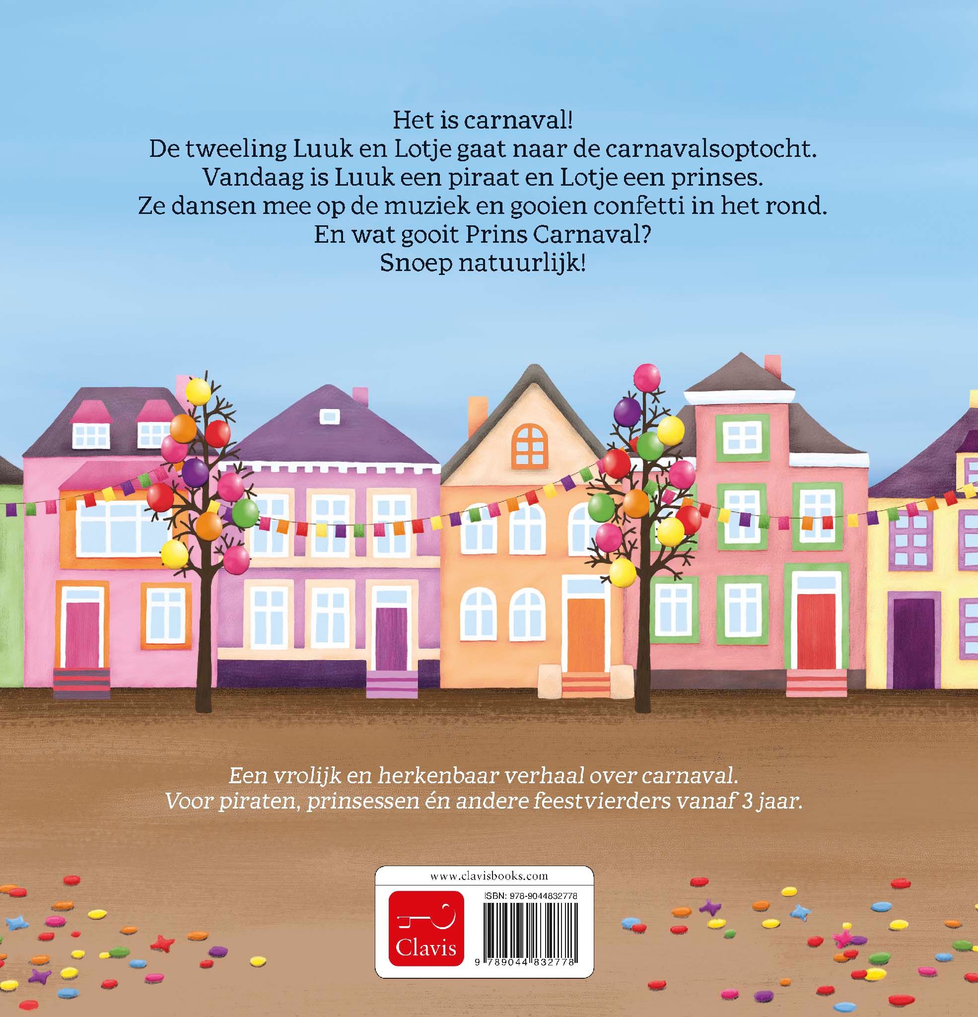 Het is carnaval! De tweeling Luuk en Lotje gaat naar de carnavalsoptocht. Vandaag is Luuk een piraat en Lotje een prinses. Ze dansen mee op de muziek en gooien confetti in het rond. En wat gooit Prins Carnaval? Snoep natuurlijk! Een vrolijk en herkenbaar verhaal over carnaval. Voor piraten, prinsessen én andere feestvierders vanaf 3 jaar.