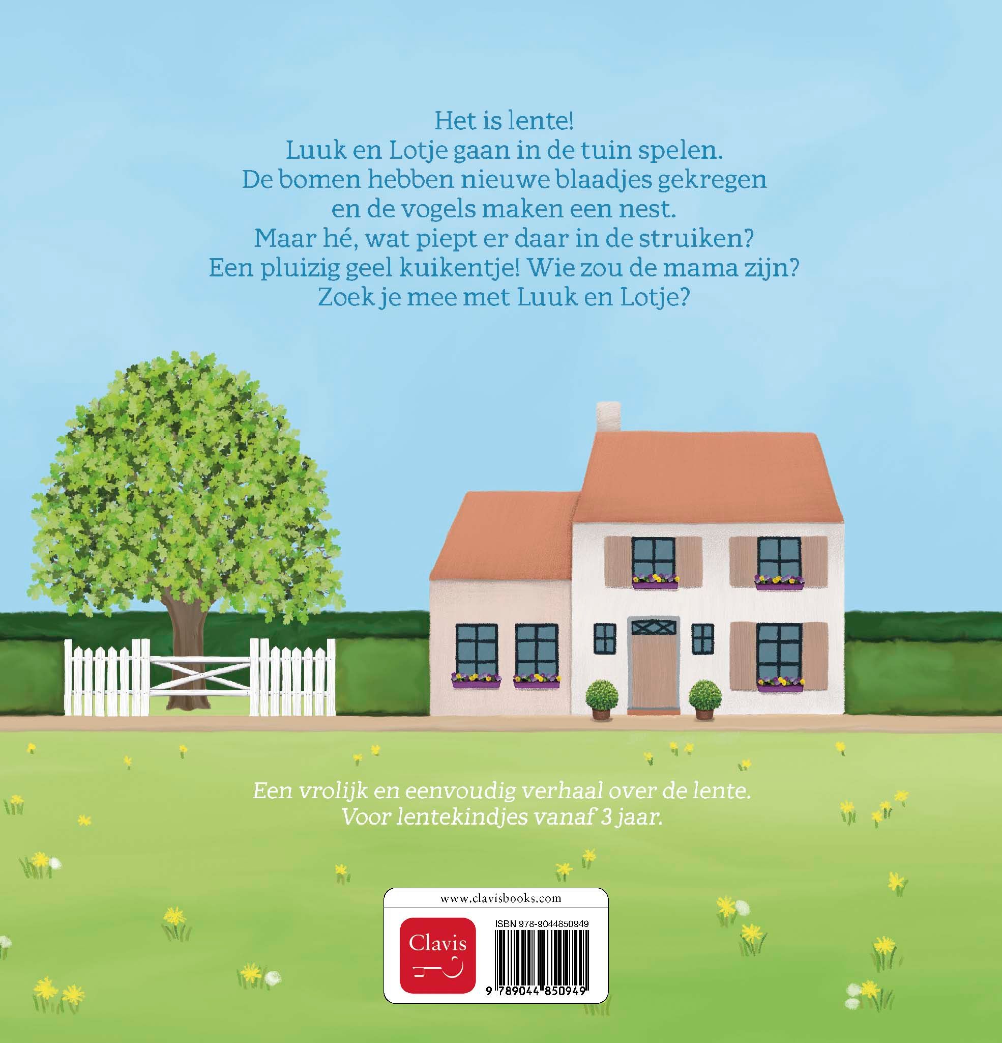 Het is lente! Luuk en Lotje gaan in de tuin spelen. De bomen hebben nieuwe blaadjes gekregen en de vogels maken een nest. Maar hé, wat piept er daar in de struiken? Een pluizig geel kuikentje! Wie zou de mama zijn? Zoek je mee met Luuk en Lotje? Een vrolijk en eenvoudig verhaal over de lente. Voor lentekindjes vanaf 3 jaar.