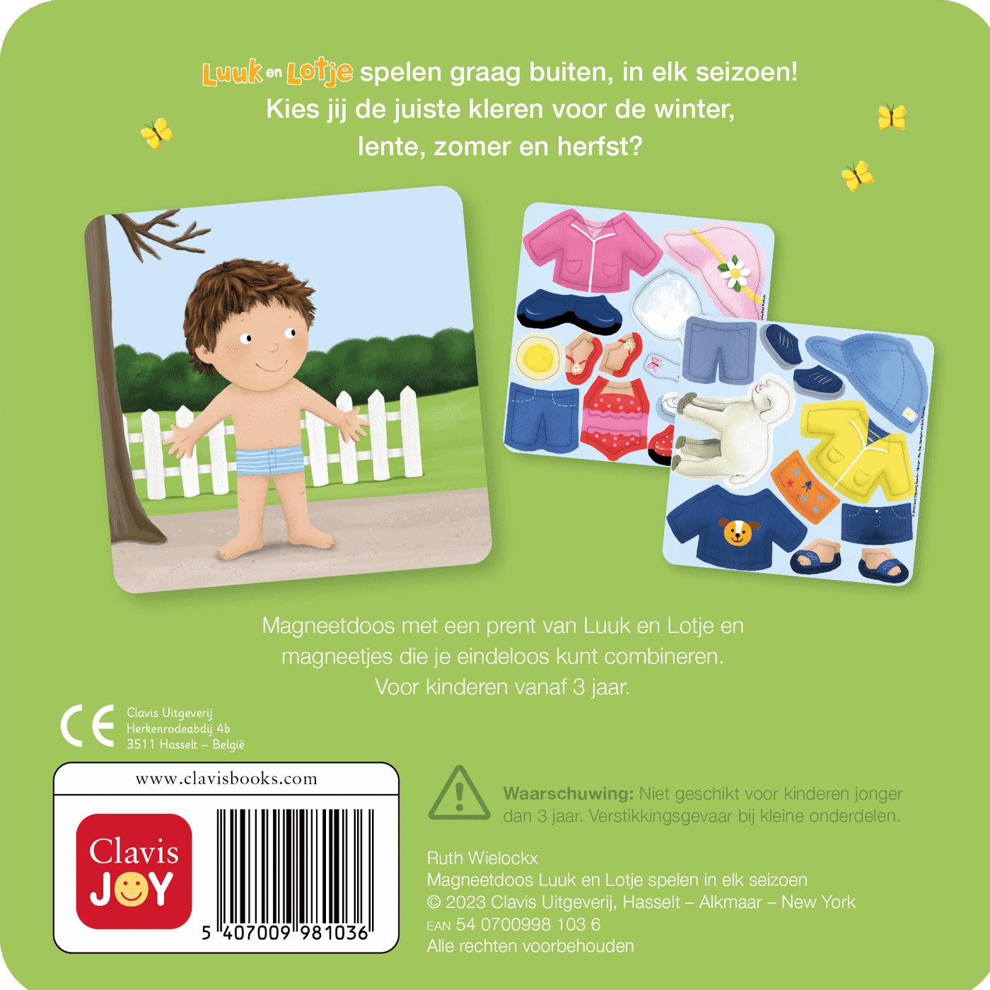 Luuk en Lotje spelen graag buiten, in elk seizoen! Kies jij de juiste kleren voor de winter, lente, zomer en herfst? Magneetdoos met een prent van Luuk en Lotje en magneetjes die je eindeloos kunt combineren. Voor kinderen vanaf 3 jaar.