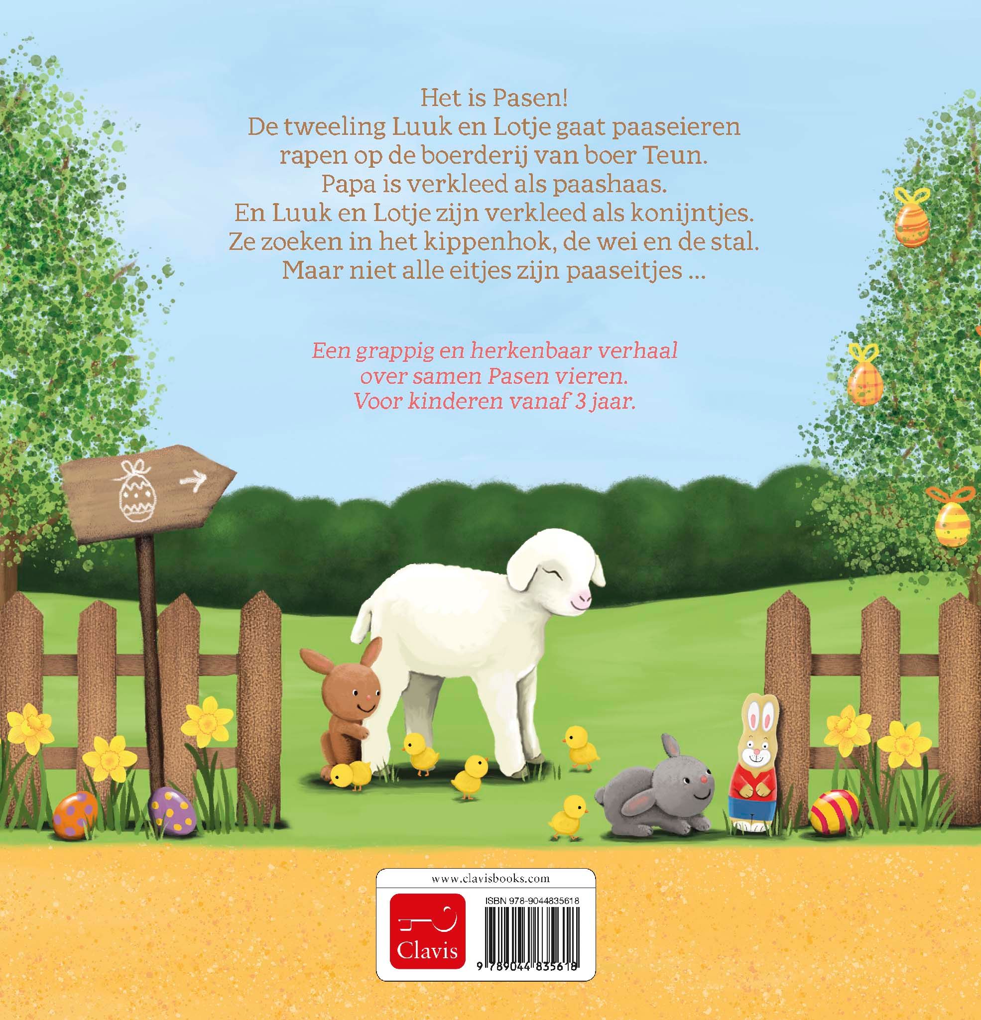 Het is Pasen! Luuk en Lotje verkleden zich en nemen een mandje mee naar de boerderij van boer Teun. Ze gaan eieren rapen. Ze zoeken in de wei tussen de lammetjes en in het kippenhok bij de kuikentjes. Zoek je mee? Een vrolijk en herkenbaar verhaal over Pasen. Voor iedereen die van de paashaas, eitjes rapen en chocolade houdt. Vanaf 3 jaar.